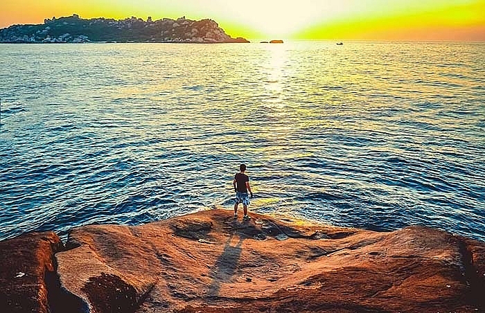 Nghỉ qua đêm ở Bãi Rạng, sáng hôm sau du khách vượt ghềnh đá khoảng 2km để ra Mũi Đôi đón ánh bình minh đầu tiên. Ánh mặt trời mỗi lúc một đỏ rực, bao quanh là những đám mây ráng hồng khiến khung cảnh thêm thơ mộng, đẹp đến nao lòng.