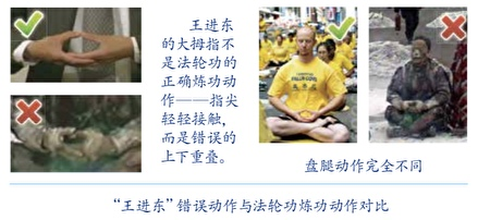 Tư thế đả tọa và thủ ấn của Vương Tiến Đông đều không phải là động tác của Pháp Luân Công. Có phân tích cho rằng, tư thế ngồi của ông ta là tư thế bắt chéo chân tiêu chuẩn của quân nhân Trung Quốc.