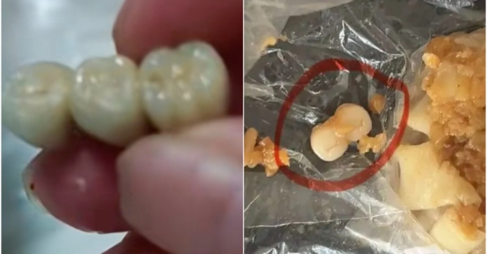 Video lan truyền trên mạng cho thấy ba chiếc răng trắng còn nguyên vẹn, theo mô tả của người này, đó là răng hàm, được sắp xếp ngay ngắn.
