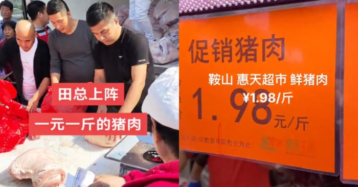 Tại một siêu thị ở An Sơn, Liêu Ninh, thịt lợn được niêm yết giá rẻ nhất chỉ 1,98 tệ/cân, thịt ba chỉ (thịt ba rọi) thường ngày có giá trên 10 tệ cũng chỉ còn 7,98 tệ/cân.