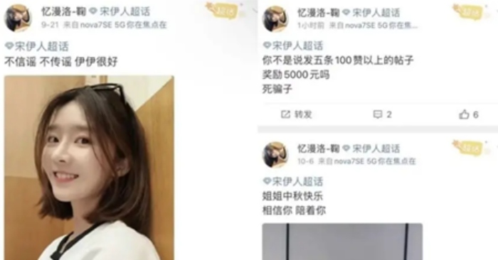 Gần đây, trên mạng lan truyền một loạt ảnh chụp màn hình. Một cư dân mạng vào tháng 9 đã đăng bài trong “super topic” (nhóm fan) của Tống Y Nhân viết: “Không tin tin đồn, không lan truyền tin đồn, Y Y rất tốt”, đồng thời đính kèm ảnh tự sướng của Tống Y Nhân để ủng hộ. Ngày 6 tháng 10, người này lại đăng: “Chị ơi, Tết Trung thu vui vẻ, tin tưởng chị, đồng hành cùng chị.” Không ngờ, thái độ của cư dân mạng này gần đây đột ngột thay đổi, tức giận viết trong “super topic” của Tống Y Nhân: “Không phải cô nói đăng 5 bài trên 100 lượt thích sẽ thưởng 5.000 nhân dân tệ (NDT) sao? Đồ lừa đảo chết tiệt.”
