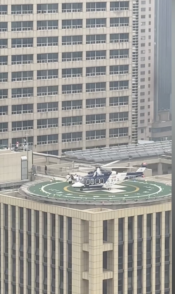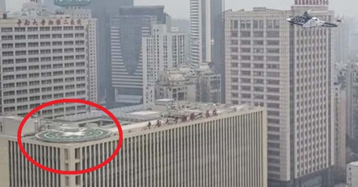 Hình ảnh cho thấy, trên nóc một tòa nhà của bệnh viện này, có xây dựng một sân bay trực thăng hình tròn màu xanh lá cây, và có trực thăng hạ cánh, cùng với nhân viên y tế vận chuyển cáng xuống máy bay.