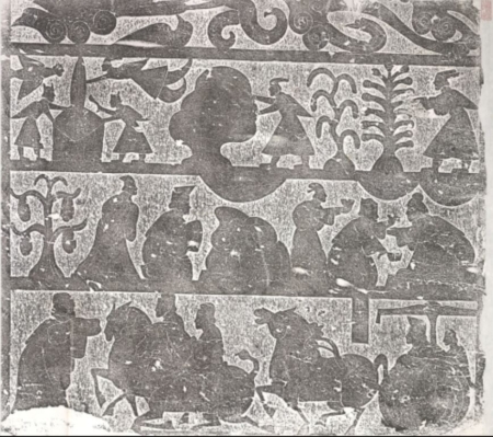 Tầng thứ hai bên phải thạch thất trước từ đường họ Vũ, phía bên trái có một cái cây sáu nhánh, cành lá rủ xuống. Bên phải ngoài cùng có một cây Minh Giáp 15 lá, bên cạnh có một người mọc cánh (vũ nhân), tay vịn cây Minh Giáp. (Ảnh: Cung cấp bởi Bảo tàng Cố cung Quốc gia)